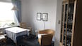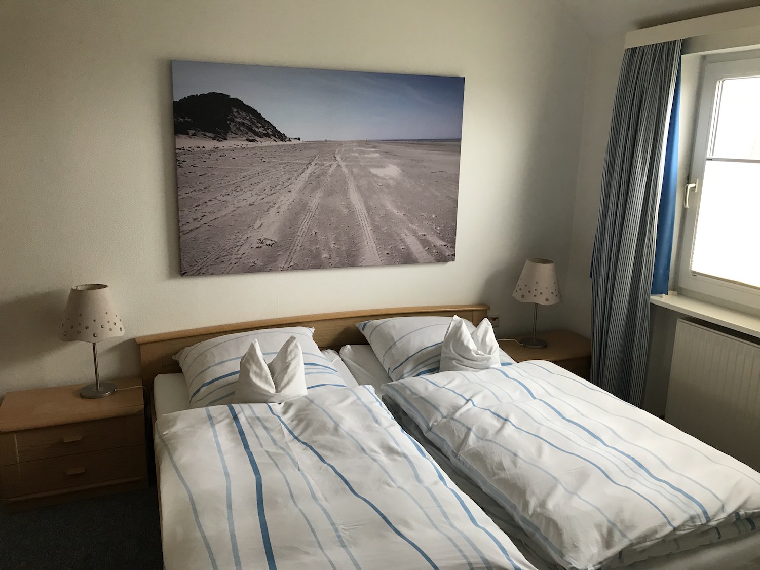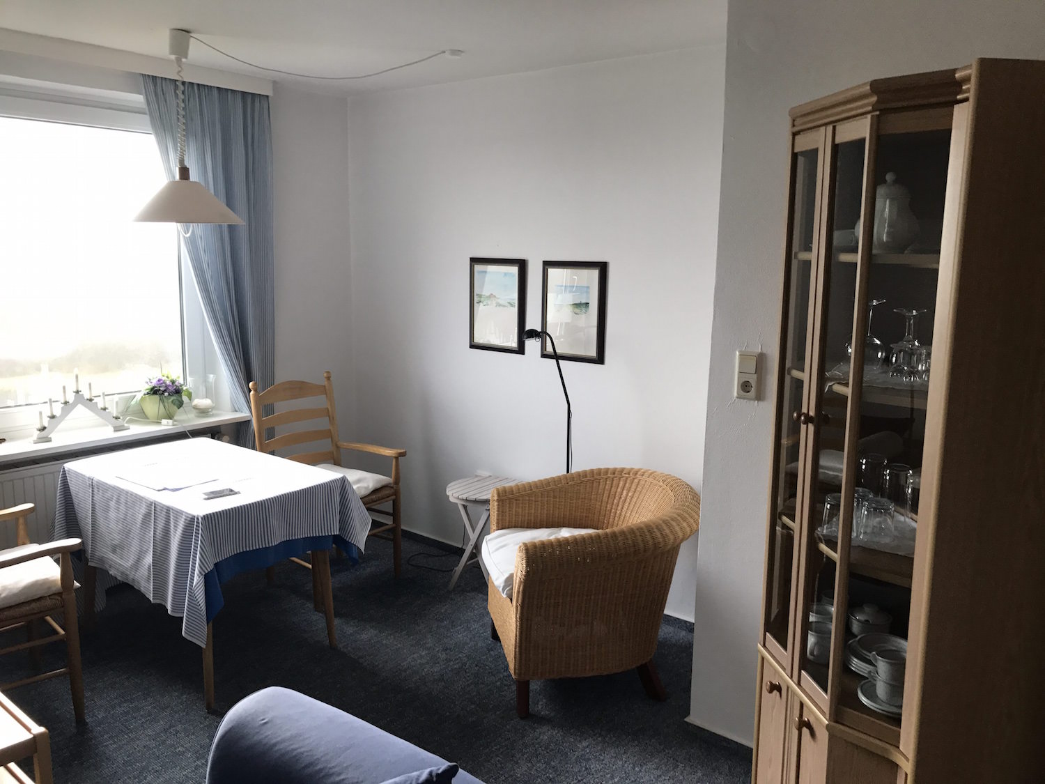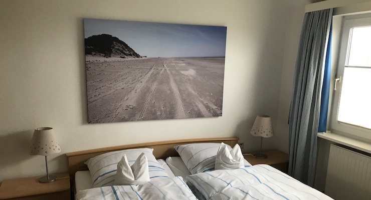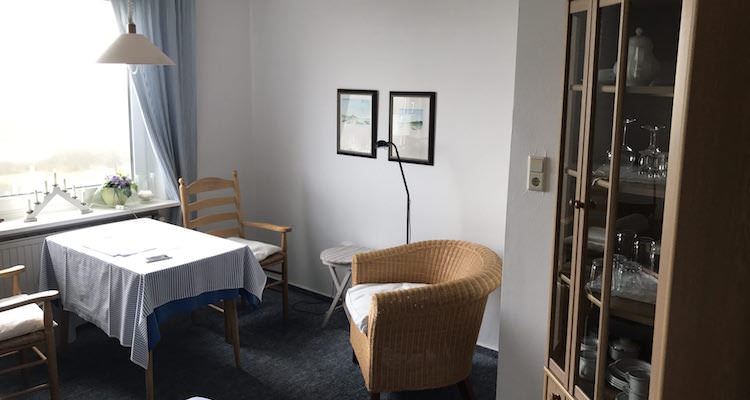Die mit Teppich ausgelegte Wohnung No.8 liegt im 1. Stock. Über den Flur mit Garderobe erreichen Sie alle Räume: links das Doppel-Schlafzimmer (mit Nachschränken, Lampen, Sessel und Ostfenster mit Blick auf das Wattenmeer), rechts das Wohnzimmer (mit Zweisitzer-Sofa, 2 Sesseln, Kleiderschrank, Glasvitrine, Küchenzeile mit 2 Plattenherd und dem Essplatz) und geradeaus ein gefliestes Bad mit Dusche/WC und Fenster mit Ostblick.
